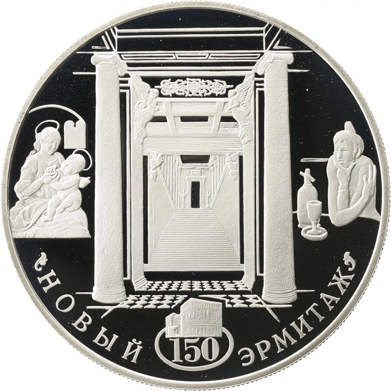 Серебряная монета Банка России из серии «150-летие Нового Эрмитажа» весом 5 унций. У нее качество пруф. Тираж: 2000 штук.