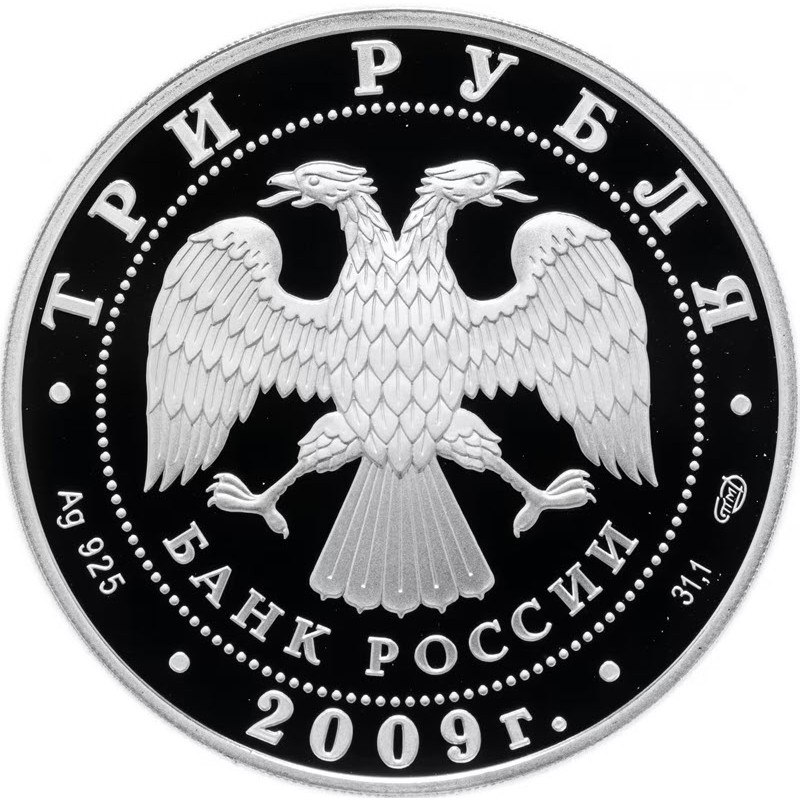 На аверсе в центре эмблема Банка России - двуглавый орел c опущенными крыльями, под ним надпись полукругом: БАНК РОССИИ. Вдоль канта надпись: ТРИ РУБЛЯ • Ag 925 • 2009 г. • 31,1 СПМД • (номинал, вес и проба серебра, год чеканки, монограмма монетного двора).