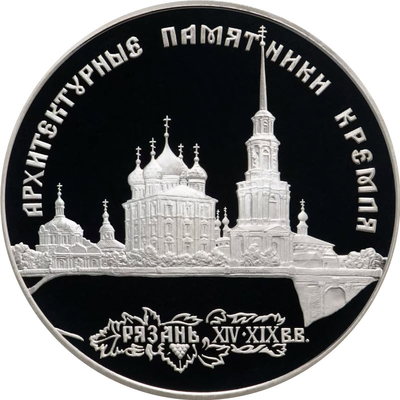 изображение архитектурного ансамбля Рязанского Кремля, вверху по окружности - надпись: "АРХИТЕКТУРНЫЕ ПАМЯТНИКИ КРЕМЛЯ", внизу в обрамлении растительного узора - надпись и даты: "РЯЗАНЬ XIV * XIX вв.".