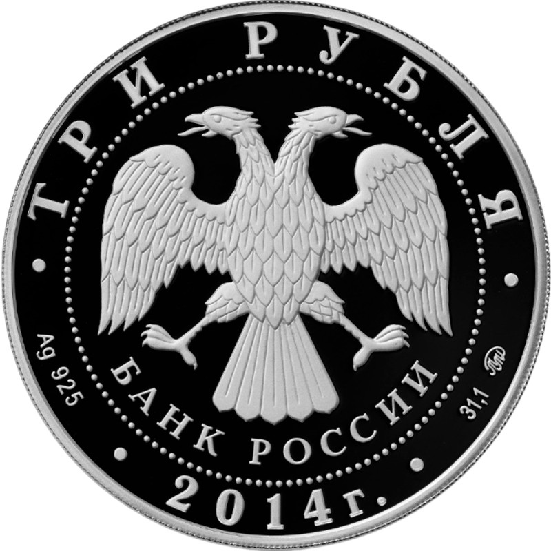 Рельефное изображение эмблемы Банка России.  Над ним вдоль канта надпись: ТРИ РУБЛЯ (номинал). Слева надпись: Ag 925 (проба серебра), справа: 31,1 ММД (вес и проба серебра, монограмма монетного двора). Внизу надпись в две строки: БАНК РОССИИ 2014 г. (банк, год чеканки).