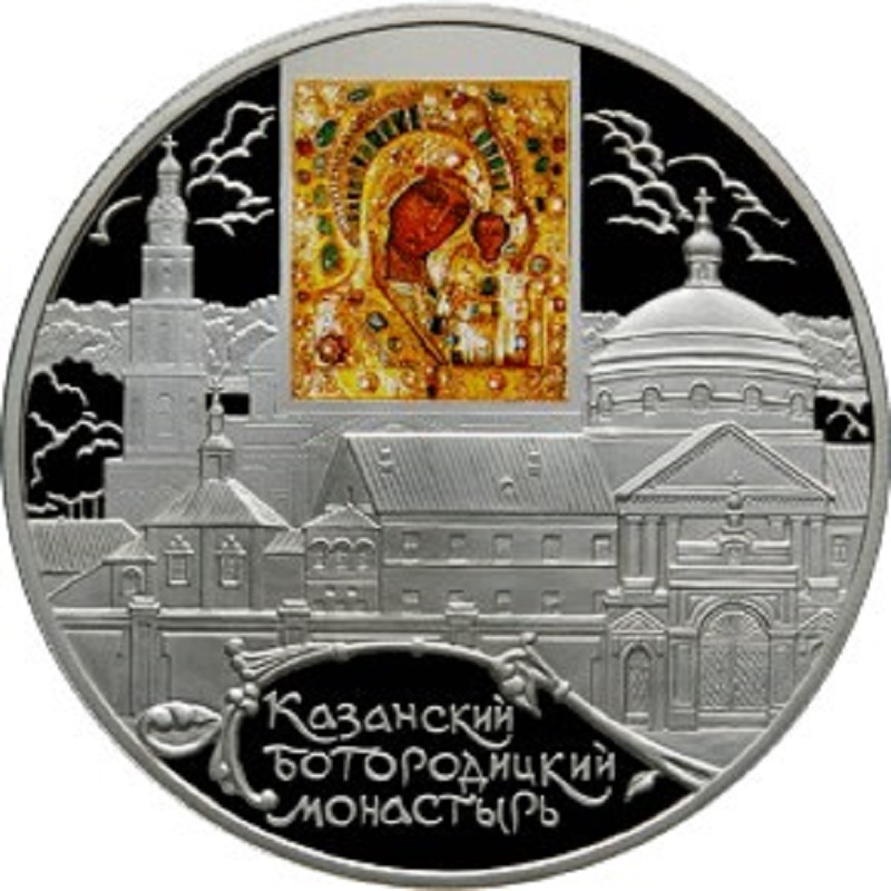 в средней части диска - архитектурный ансамбль Казанского Богородицкого монастыря, в центре вверху - цветное изображение иконы Казанской Богоматери, внизу на зеркальном поле картуша, обрамленного растительным орнаментом - надпись в три строки: "КАЗАНСКИЙ БОГОРОДИЦКИЙ МОНАСТЫРЬ".