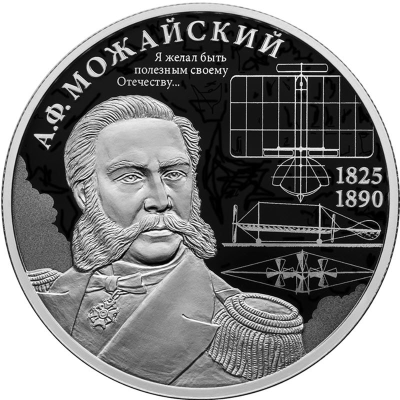 На реверсе изображен портрет А.Ф. Можайского на фоне чертежей летательных аппаратов. Вверху надпись: А.Ф. МОЖАЙСКИЙ Я желал быть полезным своему Отечеству..., справа: 1825 1890 (даты жизни).