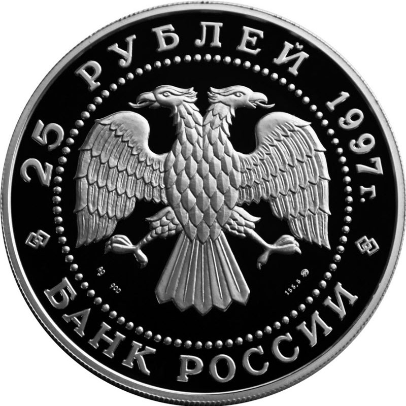 На аверсе изображена эмблема Банка России (двуглавый орел  с опущенными крыльями). Под орлом надпись: вес и проба серебра, монограмма Московского монетного двора  (Ag 900 155,5 ММД). Вдоль канта надпись: 25 РУБЛЕЙ 1997 г. БАНК РОССИИ (номинал, год чеканки, банк).