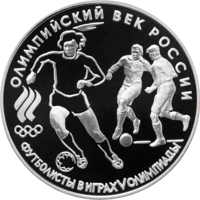 в центре - изображение современного футболиста с мячом, слева от него - эмблема Российского олимпийского комитета, справа - два футбольных игрока начала века, по окружности надписи: вверху - "ОЛИМПИЙСКИЙ ВЕК РОССИИ", внизу - "ФУТБОЛИСТЫ В ИГРАХ V ОЛИМПИАДЫ".