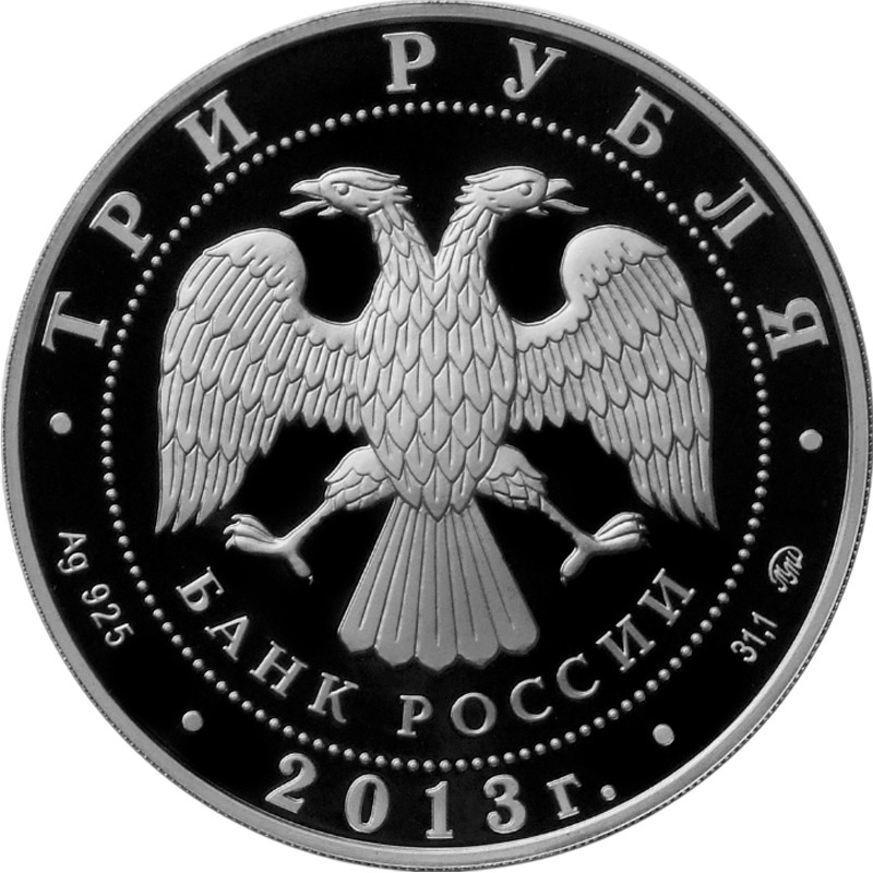 В центре — эмблема Банка России (двуглавый орёл с опущенными крыльями) под ним — надпись полукругом БАНК РОССИИ, вверху: ТРИ РУБЛЯ (номинал), внизу: слева — Ag 925 —  проба серебра, справа — 31.1 ММД — вес серебра и монограмма монетного двора, в центре — год чеканки — 2013 г.