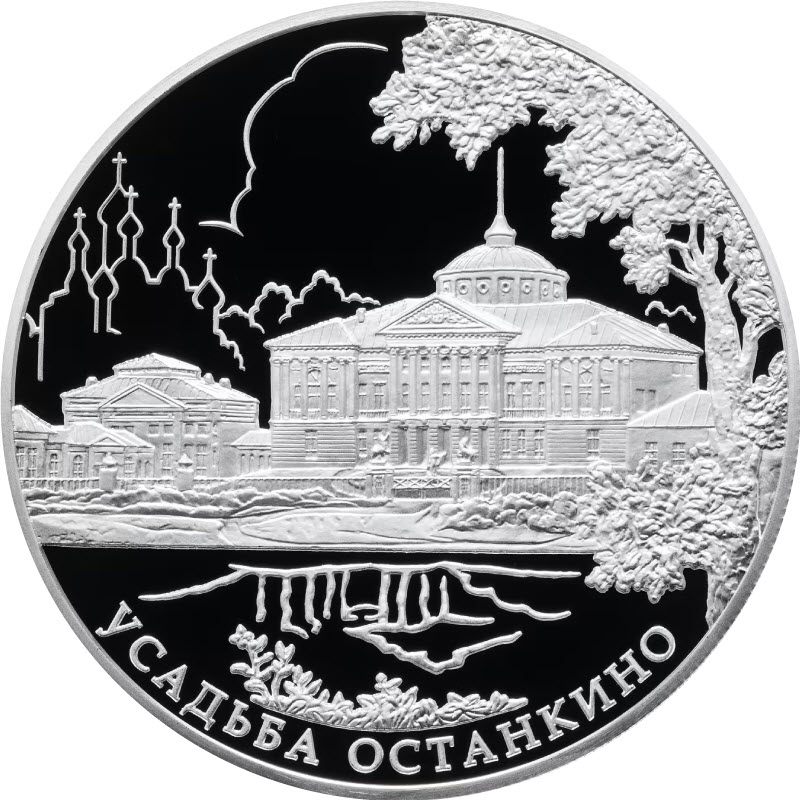 на зеркальном поле диска - рельефное изображение главного дворца усадьбы с пристройками, ниже - отражение фрагментов дворца в водной глади пруда, справа у канта - крона дерева, на втором плане слева - контурное изображение пятиглавого храма, внизу вдоль канта - надпись: "УСАДЬБА ОСТАНКИНО".