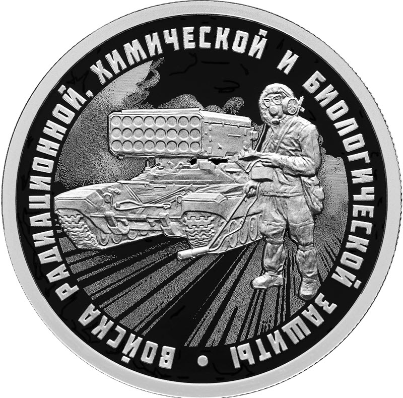 Российская серебряная монета 2026 г. выпуска качества пруф из серии «Вооруженные силы Российской Федерации» посвящена войскам РБХЗ. Тираж: 5000 штук.