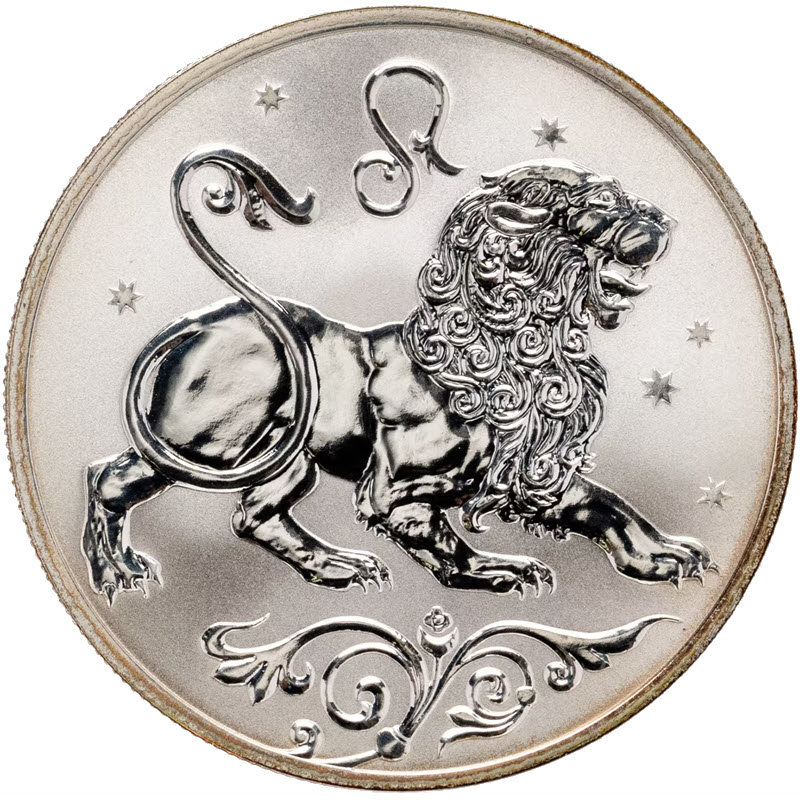 На реверсе изображение льва на фоне звезд и стилизованных растений. Вверху знак зодиакального созвездия Льва.