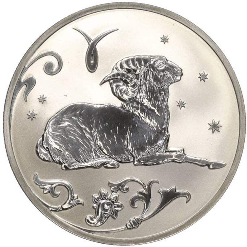 На реверсе изображение барана на фоне звезд и стилизованных растений. Вверху знак зодиакального созвездия Овна.